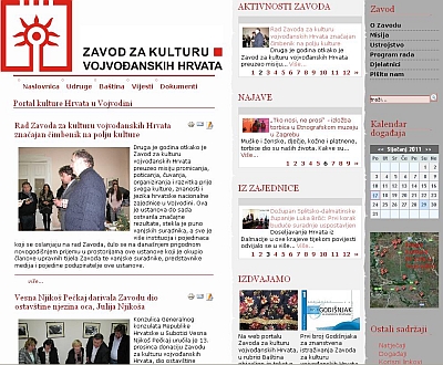 Web stranice Zavoda zamišljene su kao informativni portal cijele kulturne scene vojvođanskih Hrvata, a ne samo Zavoda kao kulturne ustanove. Uz osnovne informacije o Zavodu te aktualnih vijesti o aktivnostima kako Zavoda tako i kulturnih udruga diljem Vojvodine, na stranicama se predstavlja kultura vojvođanskih Hrvata uopće, te se mogu naći prikazi vlastite povijesti, prikazi velikana, materijalni tragovi kulture, informacije o institucijama i organizacijama, najvažnijim kulturnim manifestacijama, najave događaja i izvješća o njima... Također, stranice sadržavaju i kalendar kulturnih manifestacija hrvatskih udruga kulture u Vojvodini, čime se nastoji uvesti red i omogućiti voditeljima kulturnih udruga bolje planiranje kulturnih događaja s ciljem da se izbjegnu preklapanja. Zahvaljujući web portalu ostvarili smo brojne kontakte sa zainteresiranom javnošću, a s pojedinim posjetiteljima i započeli suradnju.