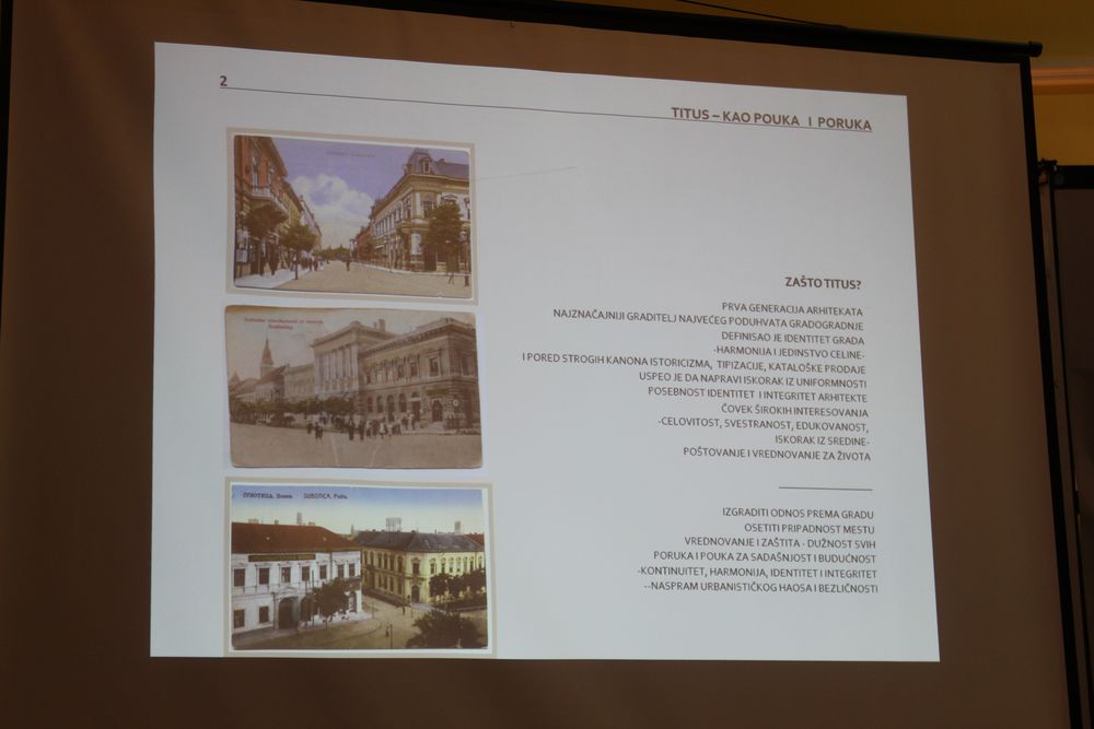 Govoriti o Titusu i njegovim građevinama važno je, istaknula je, kako bi se uspostavio bliži odnos s njima i kako bi bile sačuvane. „Jer jedan Zavod za zaštitu spomenika kulture koji ima 20 ljudi, te devet općina, ne mogu sačuvati grad. Mi svi moramo čuvati grad i boriti se za to da svi ti objekti ostanu, da ostanu čak i ako su prizemni, kojih također imamo u zaštićenoj gradskoj jezgri. Pouka i poruka Titusovog djela i tog perioda s kraja XIX. stoljeća jeste da treba graditi u kontinuitetu, treba poštovati ono što smo dobili u naslijeđe, treba graditi tako da se stvori harmonija grada, ne treba praviti urbanistički kaos.“