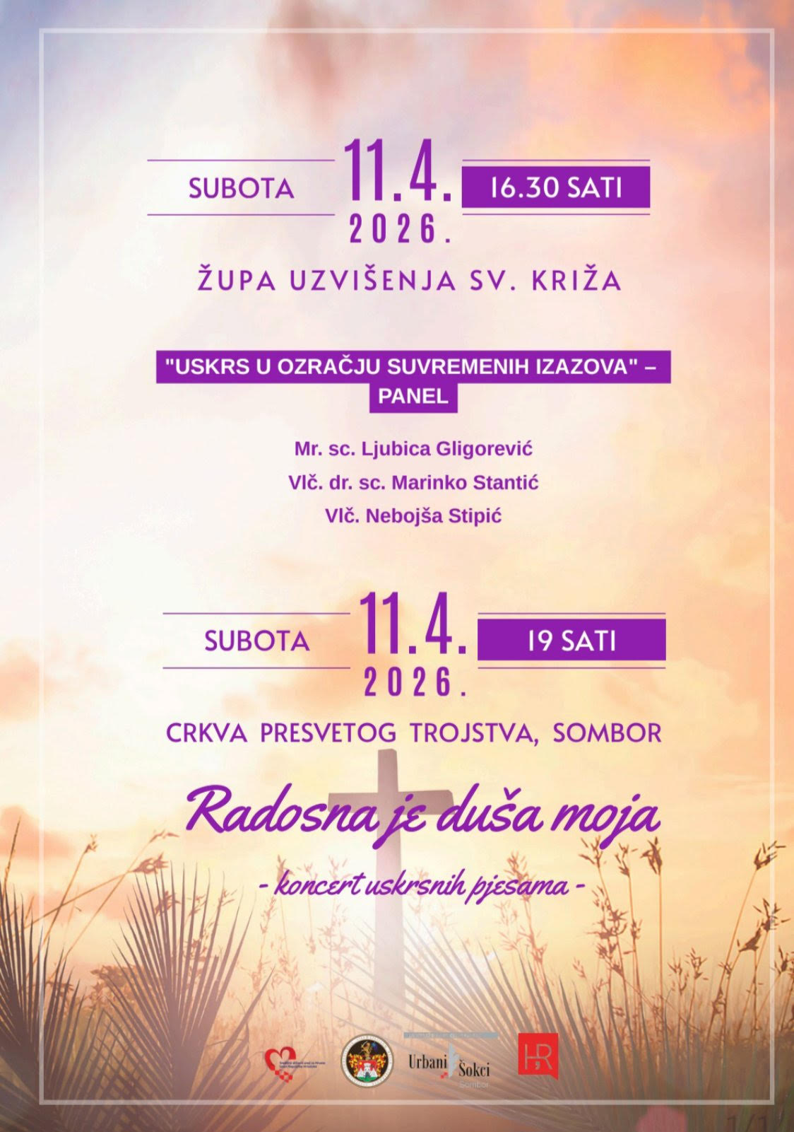 U subotu 11. travnja 2026. godine u prostorijama župe Uzvišenja sv. Križa s početkom u 16.30 sati održat će se panel diskusija Uskrs u ozračju suvremenih izazova. U programu koji organizira UG Urbani Šokci sudjeluju mr. Sc. Ljubica Gligorević, vlč. Dr. sc. Marinko Stantić i vlč. Nebojša Stipić.