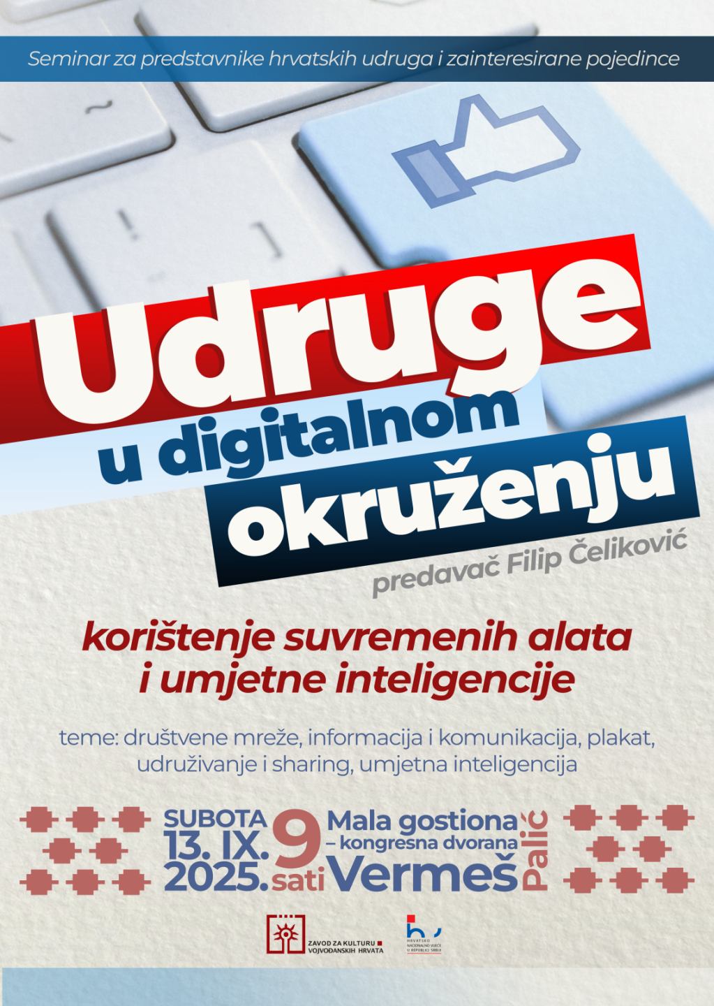 Tema skupa je Udruge u digitalnom okruženju i korištenje suvremenih alata i umjetne inteligencije, a predavač je Filip Čeliković. Na seminaru će se posebna pozornost posvetiti temama korištenja društvenih mreža, digitalnog marketinga i umrežavanja u svrhu promocije rada i djelovanja hrvatskih udruga kulture. Također će se moći steći znanja kreiranja vizuala, logotipa te namjenskih plakata za manifestacije udruga. Na susretu će se posebice dotaknuti aktualna tema umjetne inteligencije i njezinog korištenja u današnjem dobu, te kako ona može poslužiti kao koristan alat u svakodnevnom radu udruga.