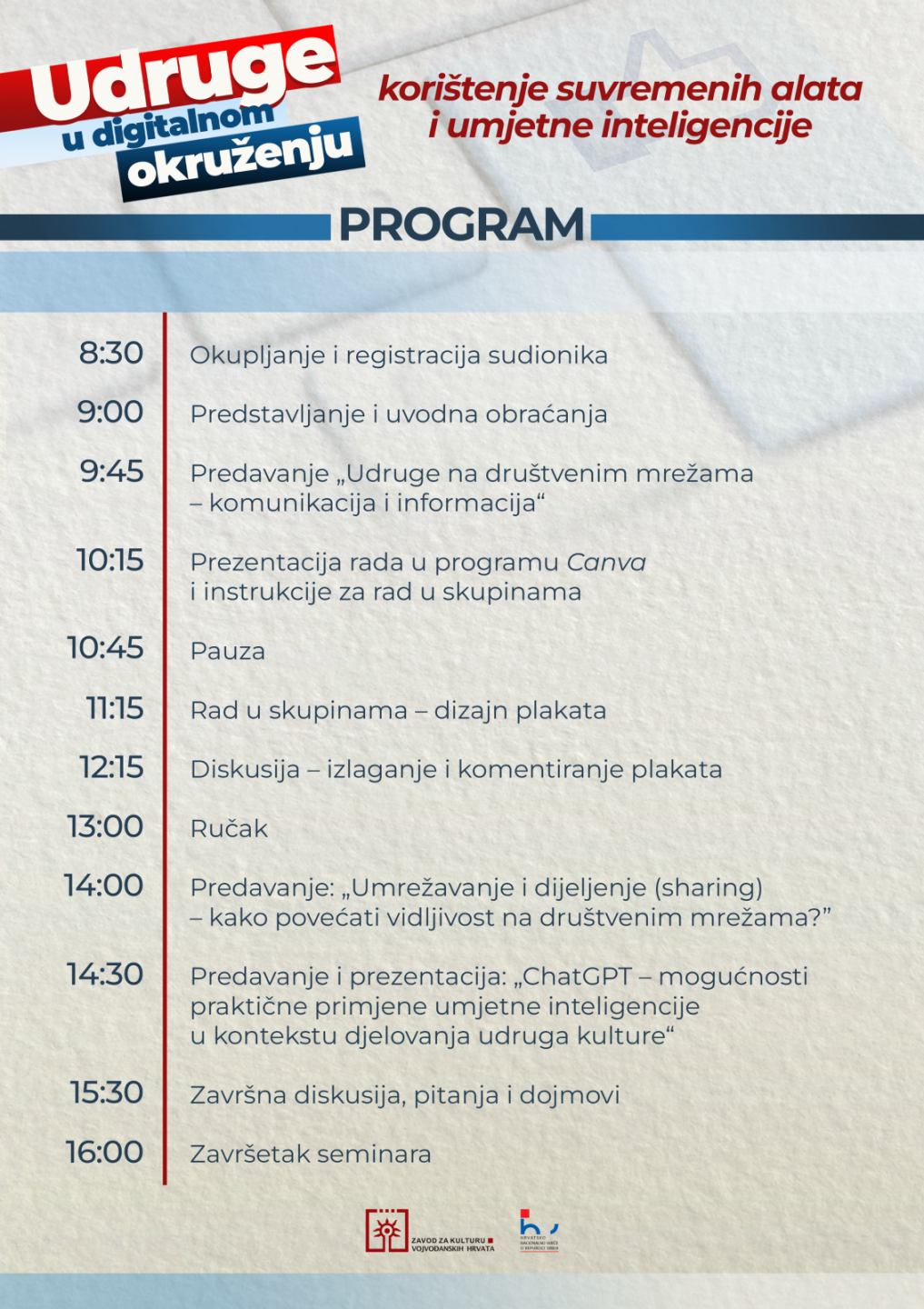 Radni susret - seminar pruža priliku članovima udruga i zainteresiranim pojedincima da steknu nova znanja o digitalnim alatima i umjetnoj inteligenciji te da ih primijene u radu i jačanju kulturnih aktivnosti hrvatske zajednice.