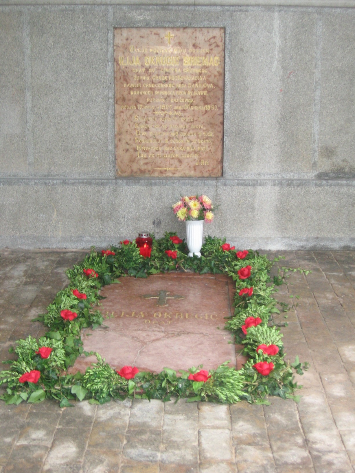 Grobna ploča Ilije Okrugića pokraj crkve na Tekijama u Petrovaradinu, snimio Petar Pifat
