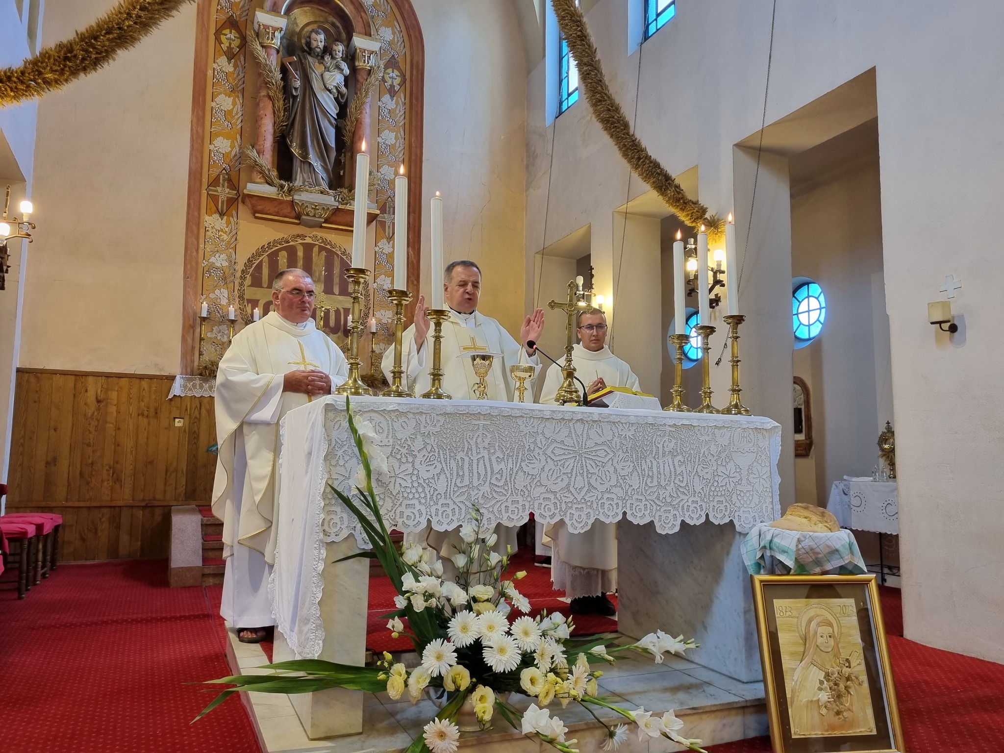 Propovjednik pater Steiner govorio je o preobraženju Kristovu, ali i o važnosti Dužijance za Hrvate Bunjevce. Može se reći kako je ovogodišnja Dužijanca u Đurđinu bila u znaku sv. Male Terezije kojoj se ove godine obilježava 150 godina od rođenja pa je njezin lik bio izrađen na slici od slame, a o njoj je govorio u propovijedi i p. Steiner. Skrenuo je on pozornost vjernicima na važnost rada s ljubavlju i zahvalnosti – odlike kojima je obilovala ova svetica. Citirajući ju naglasio je kako se sa savjesnim radom postiže svetost.