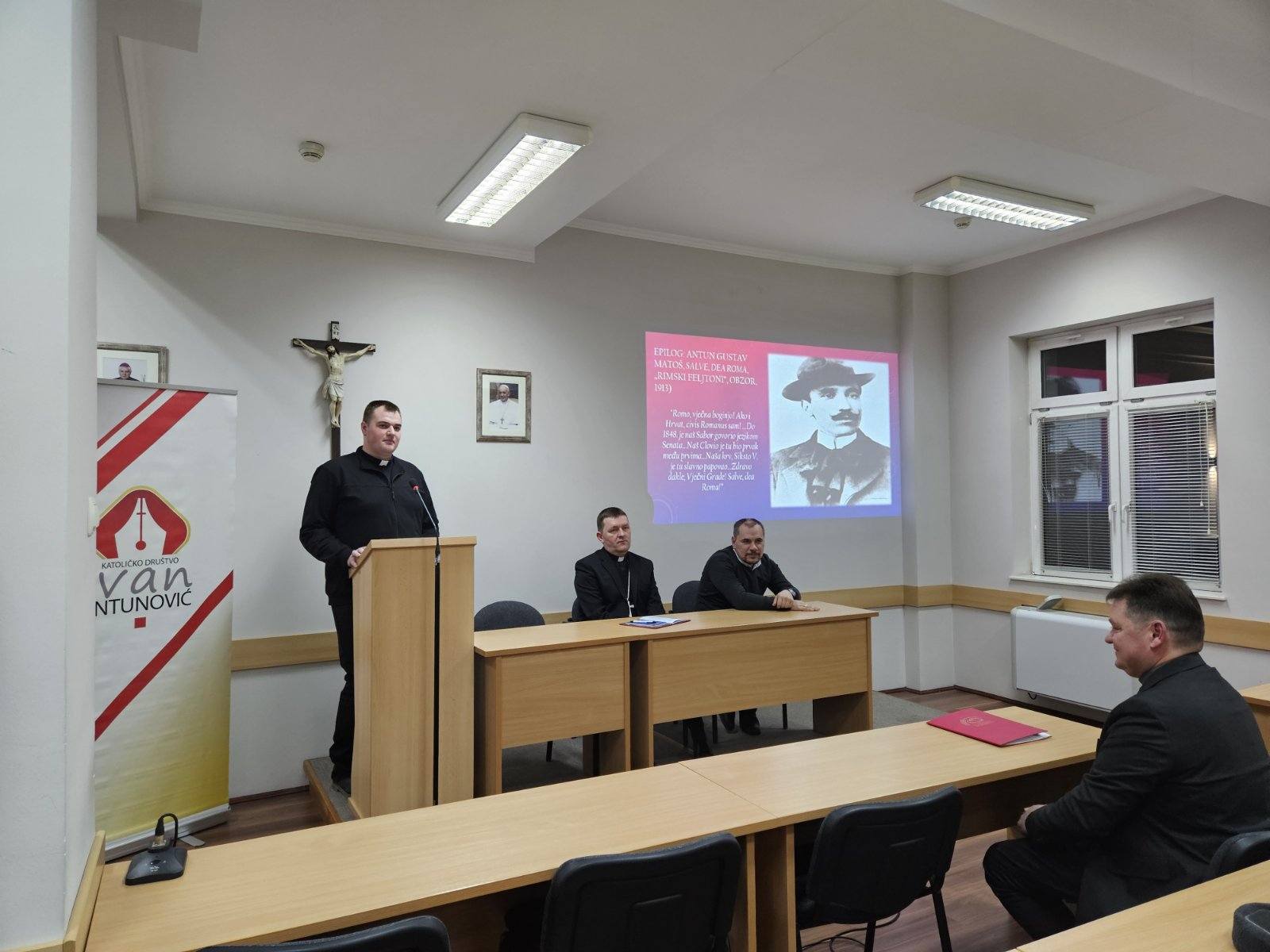 Prvo predavanje imao je gost, prof. dr. sc. Ivan Zubac koji je na zanimljiv način, uz video prezentaciju, prikazao povijesne veze hrvatskog naroda i Svete stolice, kako one iz najranije prošlosti, tako i one iz novije, s posebnim naglaskom na temom određeno razdoblje X. stoljeća, papu Ivana X. i hrvatskog kralja Tomislava.