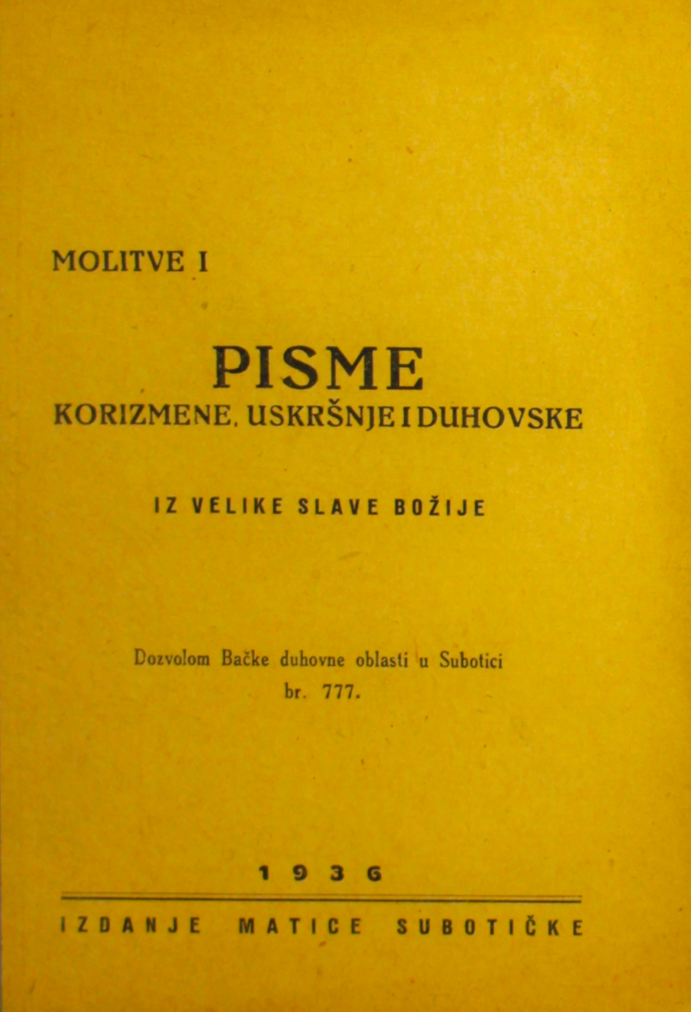 Naslov: Molitve i pisme korizmene, uskršnje i duhovske iz Velike slave Božije / Dozvolom Bačke Duhovne oblasti u Subotici