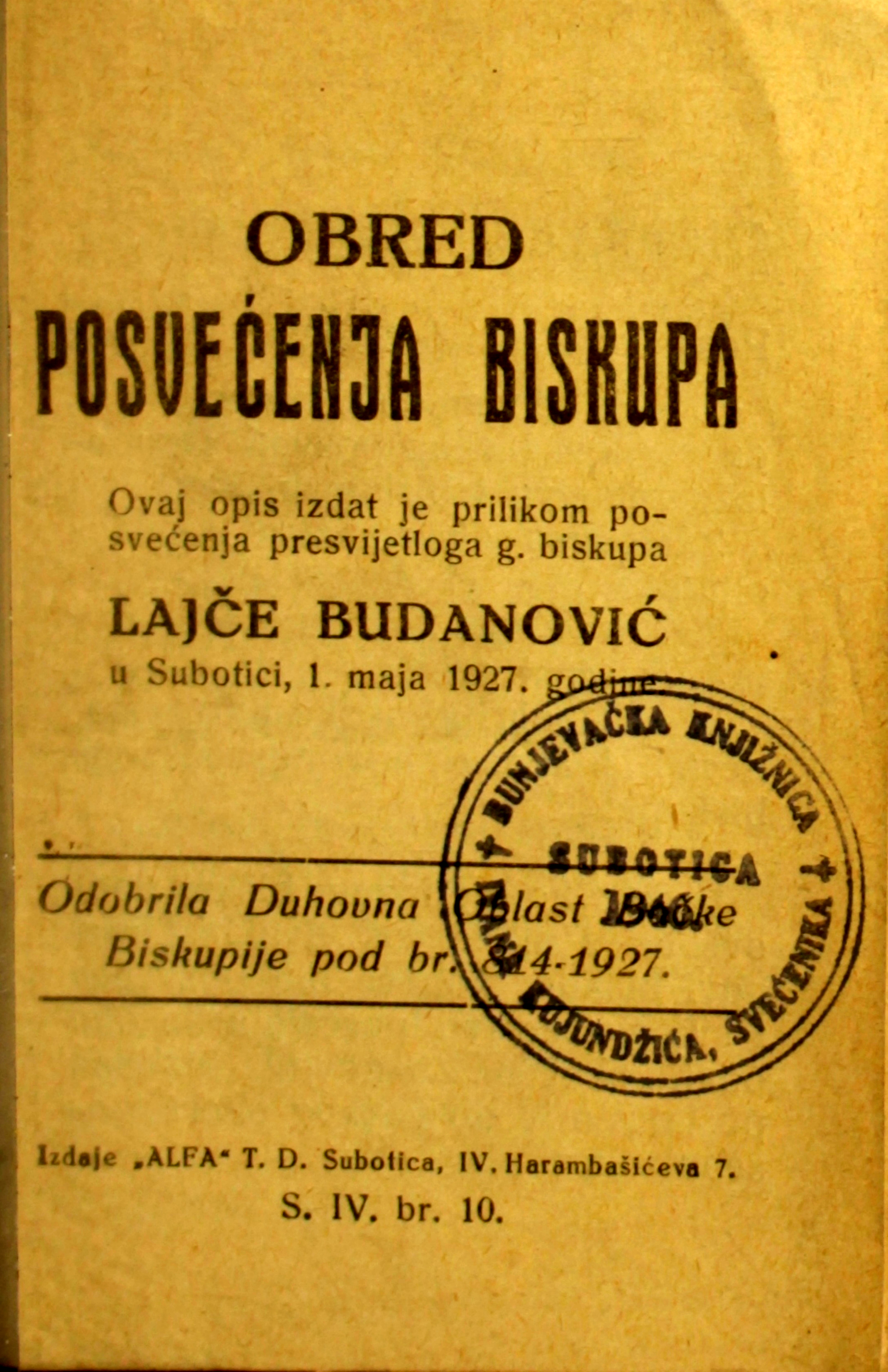Naslov: Obred posvećenja biskupa. Ovaj opis izdat je prilikom posvećenja presvijetloga g. biskupa Lajče Budanović u Subotici, 1. maja 1927. godine / Odobrila Duhovna Oblast Bačke Biskupije