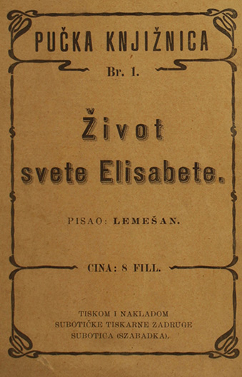 Impresum: U Subotici (Szabadka) tiskom i nakladom Tiskarne zadruge, [s. a.]. Materijalni opis: 16 str. ; 14,5 cm. Napomena: Pučka knjižnica, Br. 1. - Cina: 8 fill. – Autor u knjizi Lemešan. UDK 929 Sveta Elizabeta |