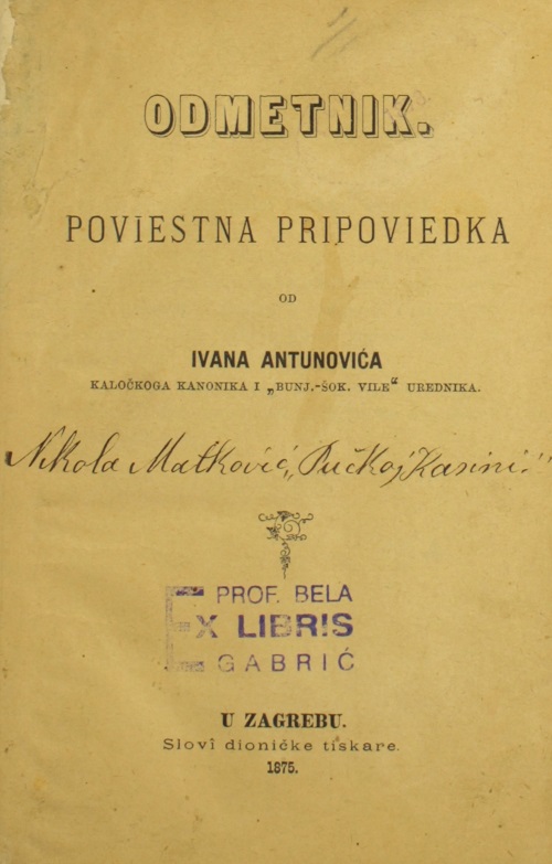 Naslov: Odmetnik : poviestna pripoviedka / od Ivana Antunovića