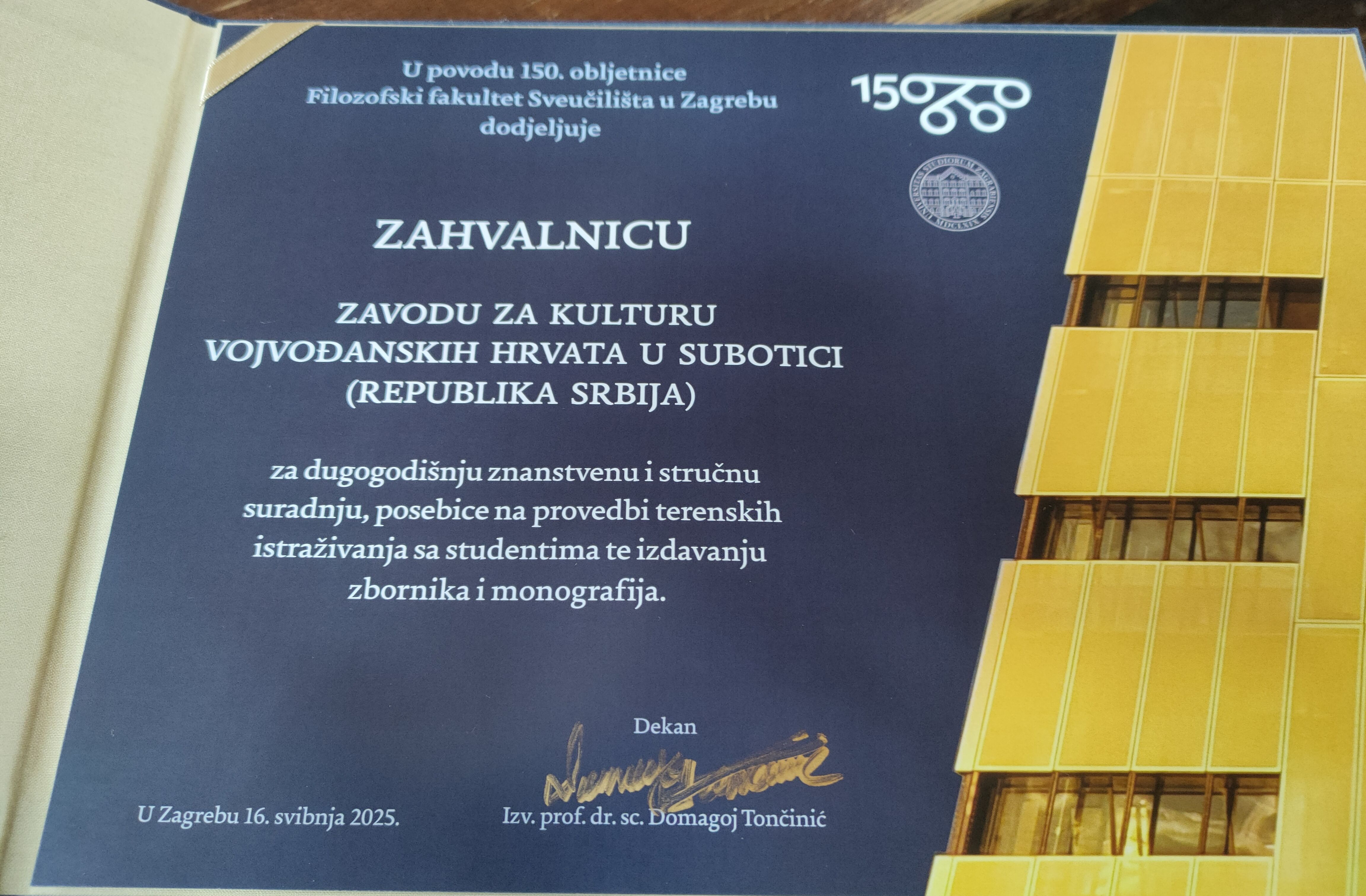 Zavod za kulturu vojvođanskih Hrvata s ponosom prima ovo priznanje te izražava spremnost za nastavak zajedničkih znanstvenih i stručnih projekata u budućnosti.