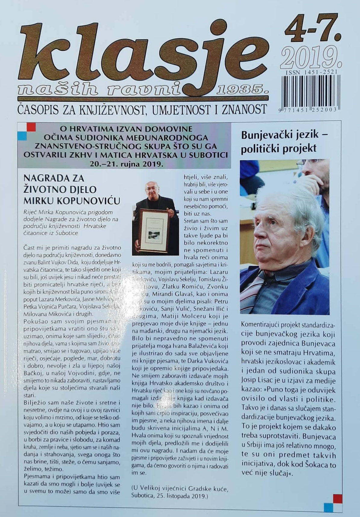 Krajem 2019. godine Izišao je novi svezak Časopisa za književnost, umjetnost i znanost Klasje naših ravni (broj 4-7 za 2019. godinu). Novi svezak donosi tekstove o međunarodnom stručnom skupu Kultura Hrvata u Vojvodini – od bogatog naslijeđa k procesima razvoja koji je održan u suradnji sa Središnjicom Matice hrvatske, radu ogranka Matice hrvatske u Subotici, nakladništvu NIU Hrvatska riječ u kontekstu nakladničke produkcije Hrvata u Srbiji, suvremenoj hrvatskoj postmodernističkoj knjiženosti u izvandomovinskom kontekstu, ženskom pismu Hrvata u Vojvodini, te novom svesku Leksikona podunavskih Hrvata – Bunjevaca i Šokaca. Časopis donosi i kratke priče Stjepana Bartoša i Mirka Kopunovića te poeziju Matije Molcera. Također, tu je i nekoliko prikaza novih knjiga.